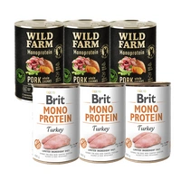 Brit Mono Protein Turkey & Sweet Potato 6x400 g + Wild Farm Monoprotein Pork 6x400g