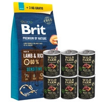 BRIT Premium By Nature Sensitive Lamb 15 kg + 3 kg & Wild Farm Monoprotein Pork 6x400g hypoalergénne krmivo pre psov